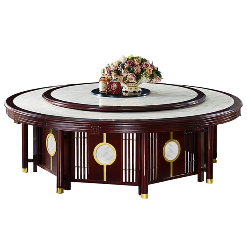 高檔飯店新中式實(shí)木飯桌電動(dòng)大理石餐桌圖