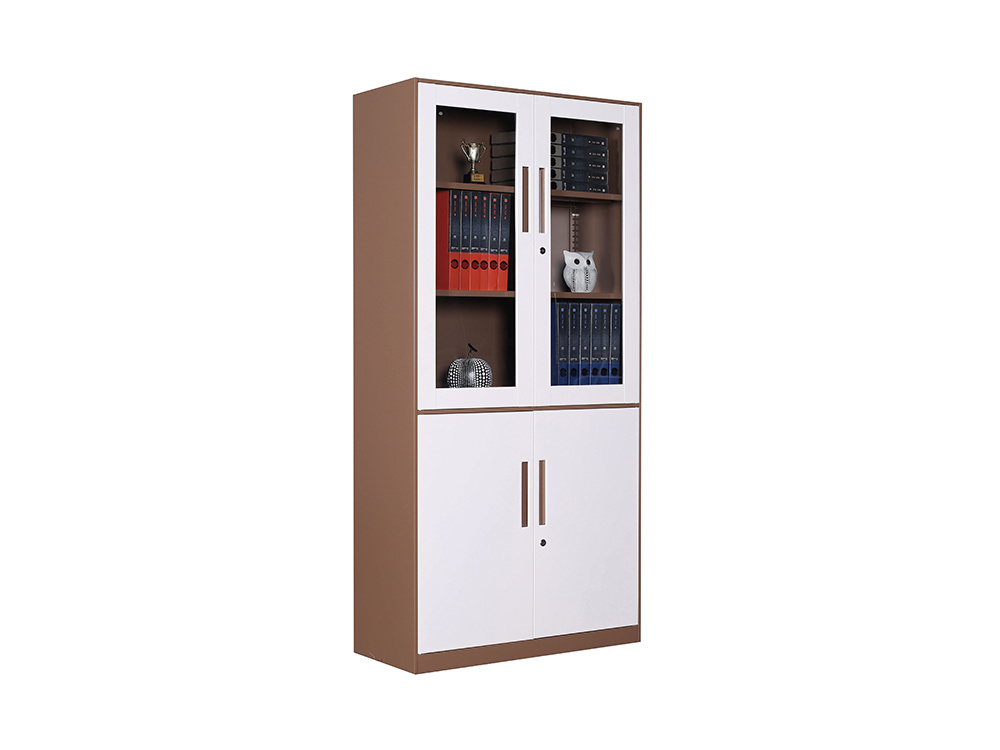 ● 一體結(jié)構(gòu)設(shè)置,上部玻璃對(duì)開(kāi)門(mén),內(nèi)置1層層板可調(diào)高度,內(nèi)置物品可視,便于拿取,中間2個(gè)抽屜,下部對(duì)開(kāi)鐵門(mén)、門(mén)內(nèi)一格板,設(shè)置有拉手和鎖。