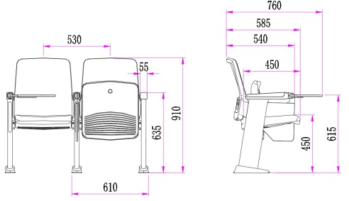 2.座椅基本中心距為530±5mm,座包打開側(cè)深585±5mm,寫字板打開側(cè)深760±5mm,基本椅高為910±5mm,最小排距:850mm。