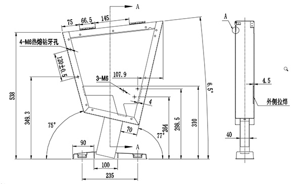 扶手寫字板向上傾斜6.5度,需提供五金站腳小樣一個。