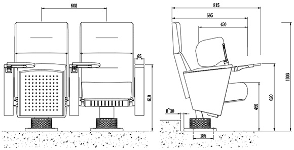 2.座椅基本中心距為600±5mm,座包打開側深695±5mm,寫字板打開側深815±5mm,基本椅高為1000±5mm,最小排距:900mm。