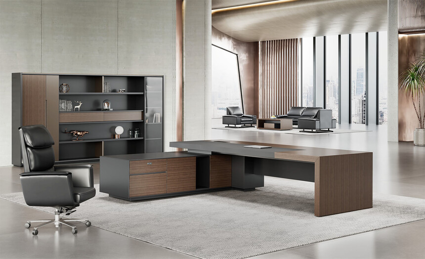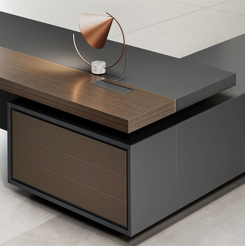明哲系列辦公家具,采用直紋胡桃和星空灰實(shí)色漆元素,高檔實(shí)木質(zhì)感飾面,深邃飽滿,紋理清晰,內(nèi)蘊(yùn)深厚。搭配簡(jiǎn)約端正的造型設(shè)計(jì),臺(tái)腳的斜切裝置,還有產(chǎn)品的布局變化,錯(cuò)落有致,承前啟后,展現(xiàn)極致簡(jiǎn)潔和視覺(jué)效果的完美詮釋。低調(diào)又不失時(shí)尚,穩(wěn)重又不失靈動(dòng),既營(yíng)造現(xiàn)代時(shí)尚的情緒,還給當(dāng)今辦公環(huán)境注入明亮、輕松的舒適感。