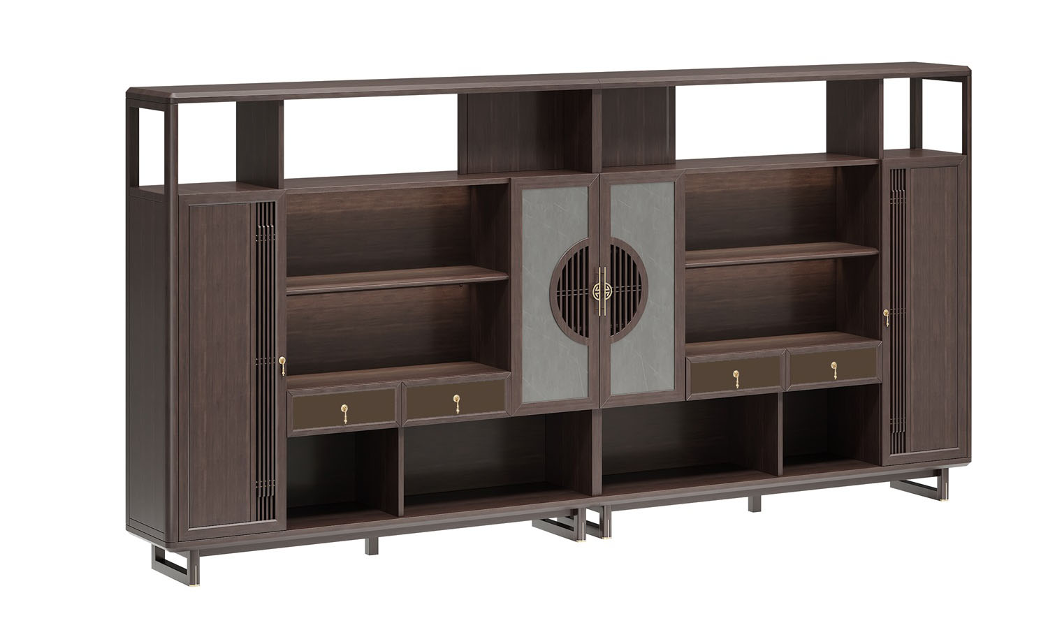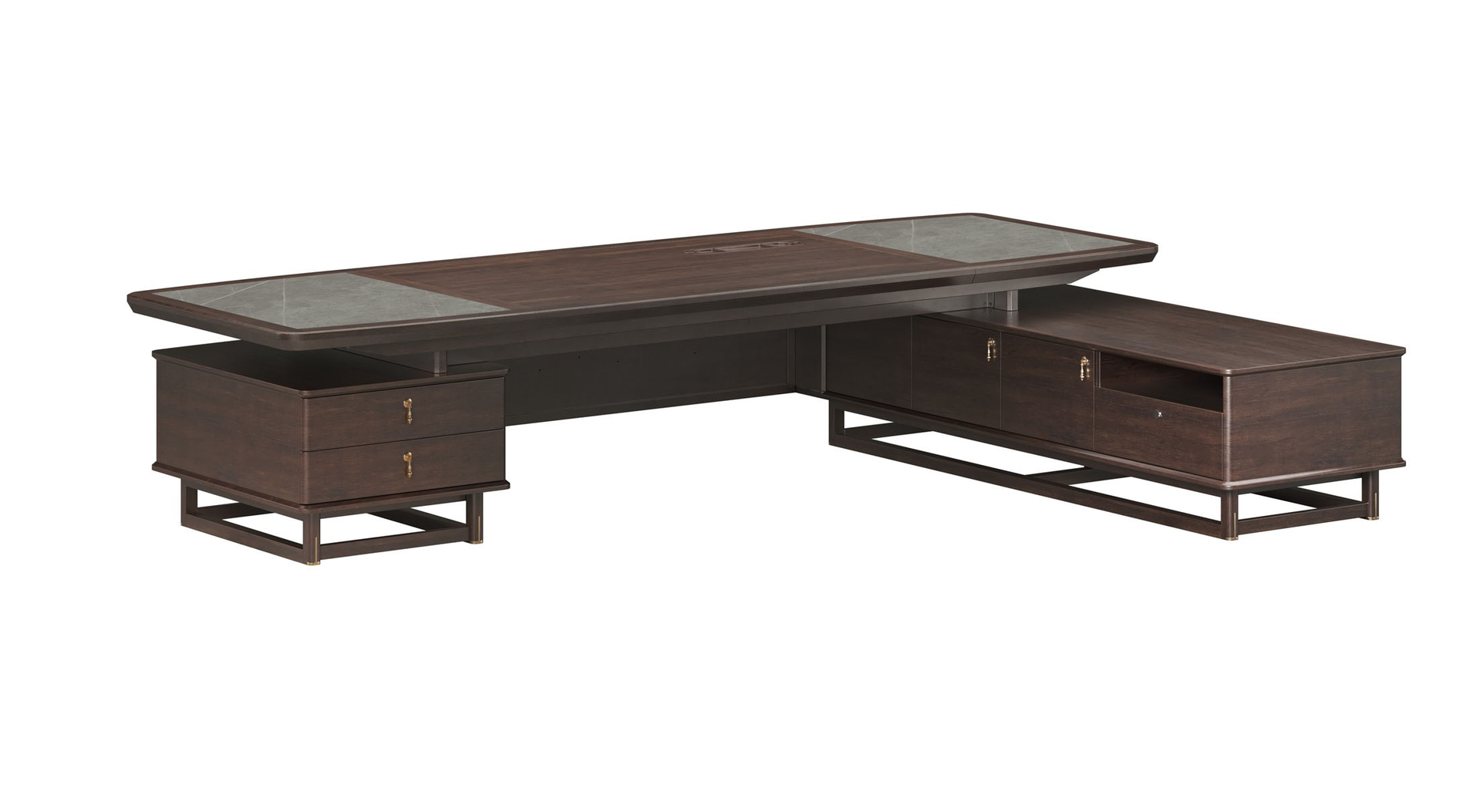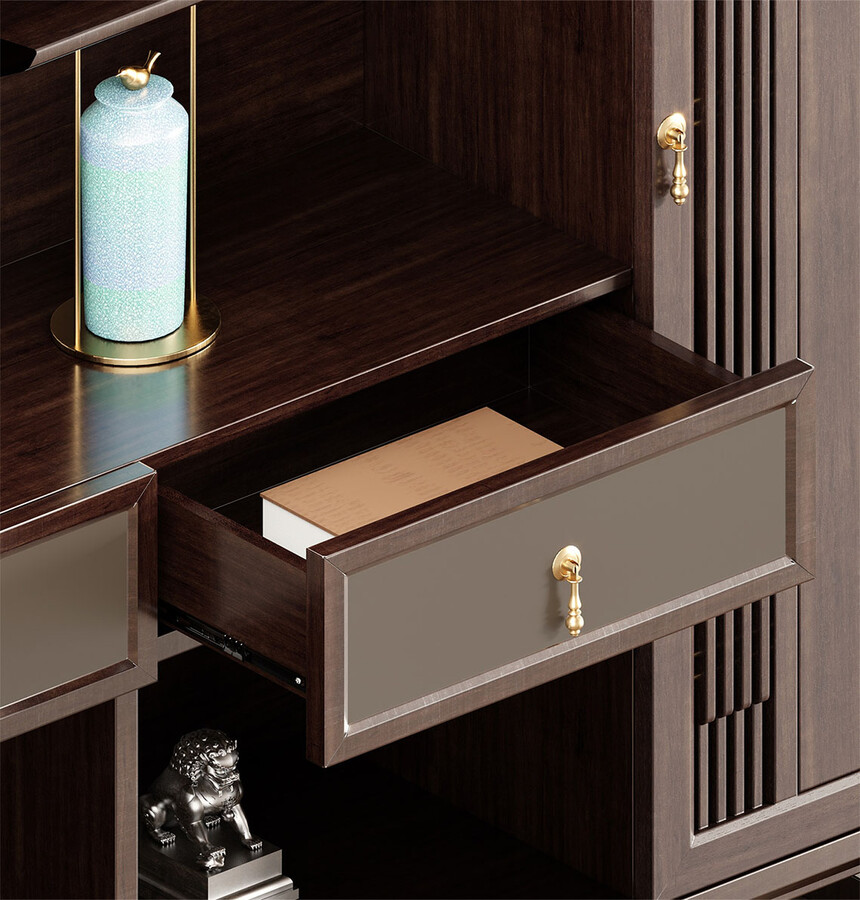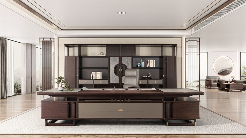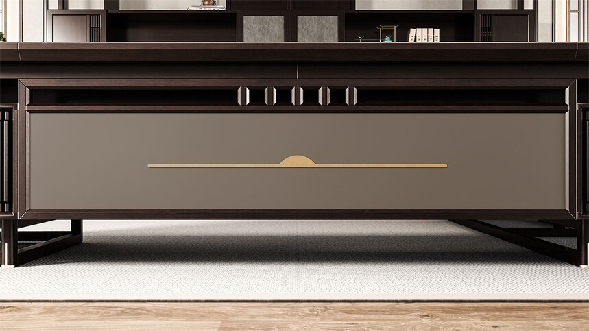 鴻泰系列是一款新中式風(fēng)格的辦公家具,設(shè)計(jì)靈感源于中式傳統(tǒng)裝飾紋樣“回”字形,因其形式回環(huán)反復(fù),延綿不斷,在民間有“富貴不斷頭”的說(shuō)法,有連綿不斷、吉利長(zhǎng)久的吉祥寓意,在造型上主要采用硬朗簡(jiǎn)潔的直線條,溫潤(rùn)的烏金木與質(zhì)樸的巖板相結(jié)合,剛?cè)岵?jì),時(shí)尚大方,既使得中式家具古典、質(zhì)樸的內(nèi)涵顯現(xiàn),又符合現(xiàn)代辦公追求的時(shí)尚感、實(shí)用性。
