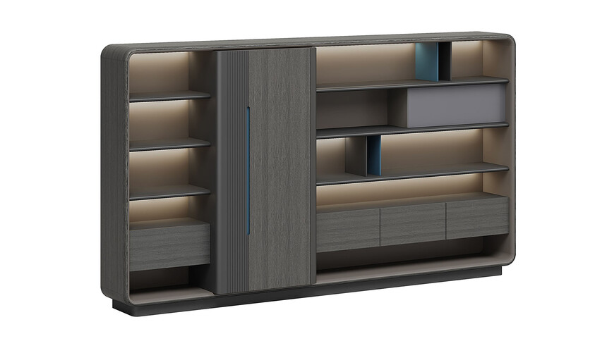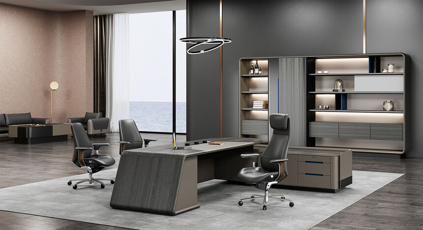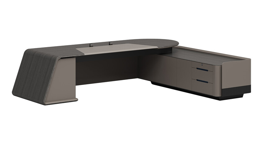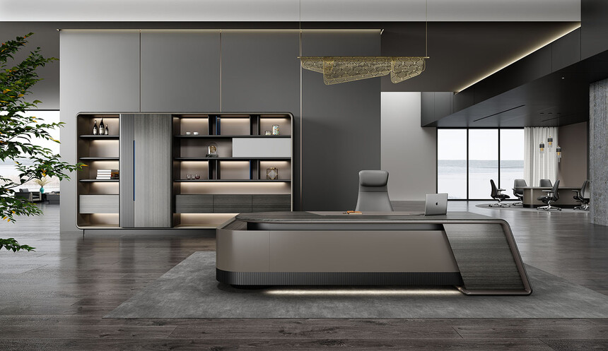 浩睿系列正如產(chǎn)品名“浩?!彼⒁庖粯樱悄哿水a(chǎn)品研發(fā)創(chuàng)新思維與廣大智慧的結(jié)晶,專為商界精英與企業(yè)領(lǐng)袖而設(shè)計。采用了泰國灰橡為主色,配上咖啡灰色漆,紋理精致清晰、立體感與時尚感極強、立體感十足的格柵設(shè)計,層次感現(xiàn)代感實用性兼?zhèn)?。圓形臺面,側(cè)柜與擋板弧形連接,弧形柔和設(shè)計,無不展示出浩睿系列的細節(jié)之美,款式簡潔又不失莊重。