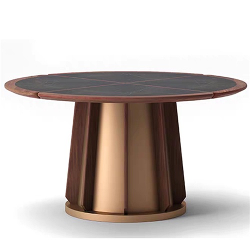 餐廳家具廠家為您展示現(xiàn)代中式餐廳包房鈦金不銹鋼巖板圓桌圖片展示\價格說明\定做服務。